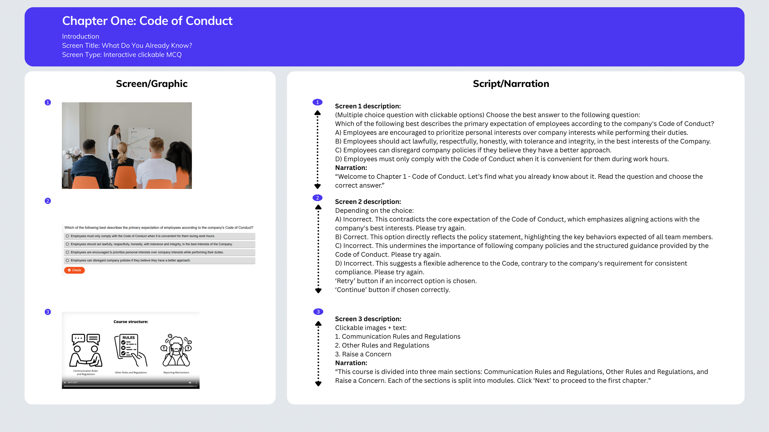 The course consists of three content modules, each addressing a core pillar of ethical behavior and communication at the company: