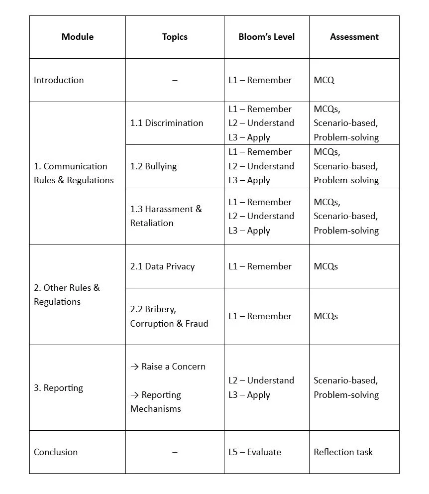 This course was created as the opening chapter of a broader Corporate Communications learning track to be part of employee onboarding. Designed for a global, multicultural workforce, it helps employees build a shared understanding of respectful behavior, responsible decision-making, and their role in maintaining an ethical workplace.